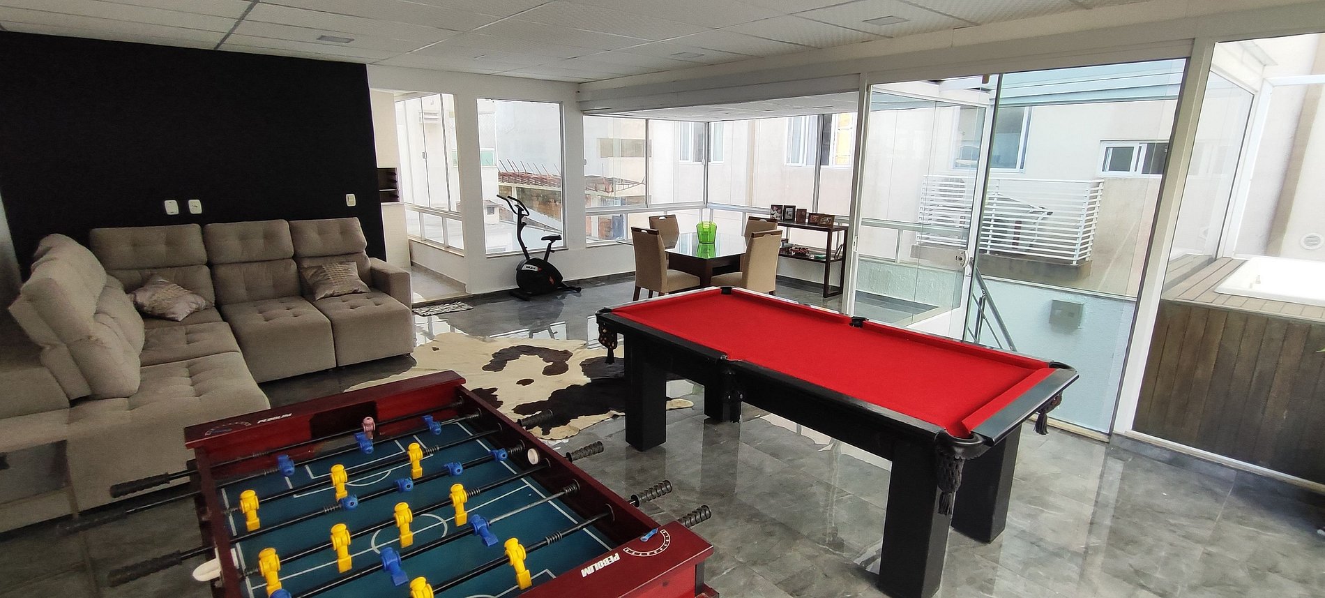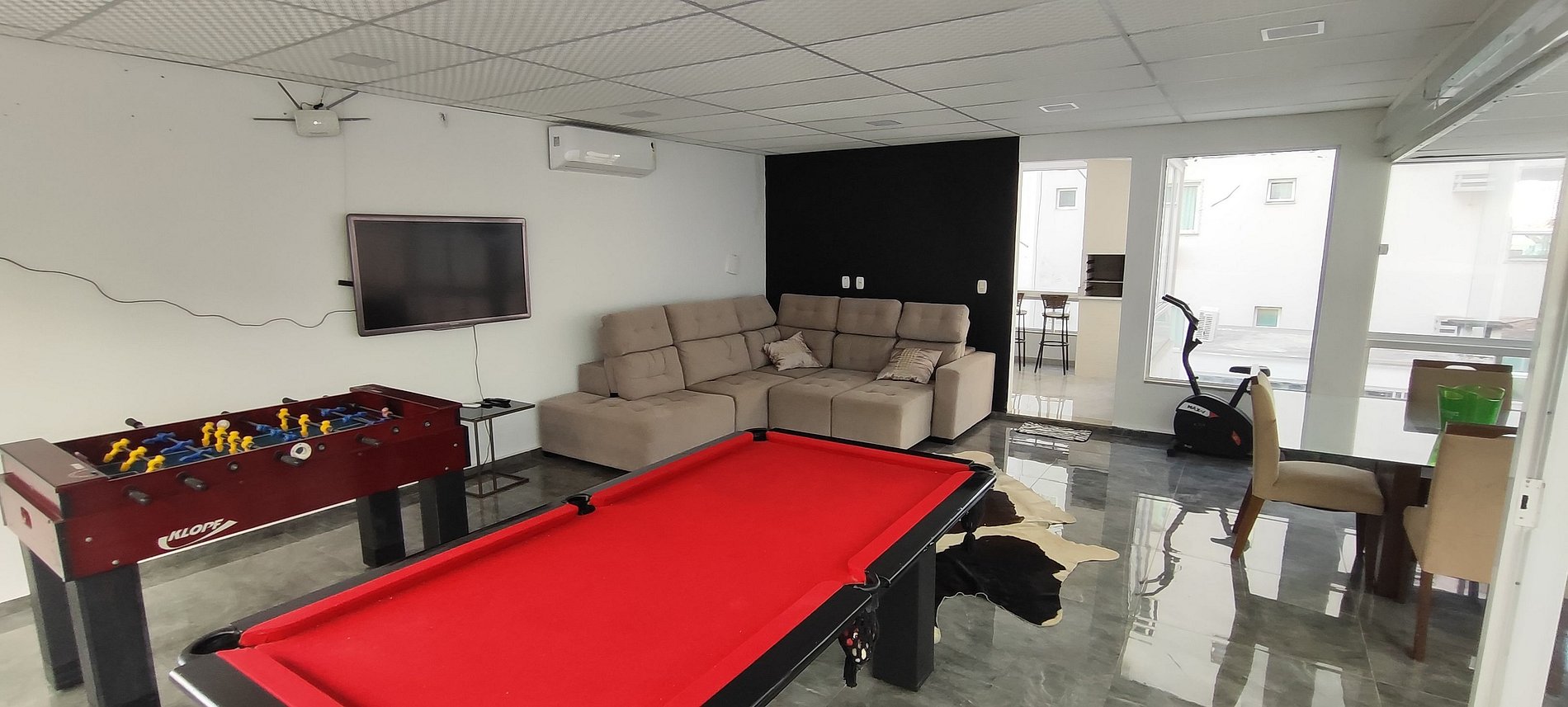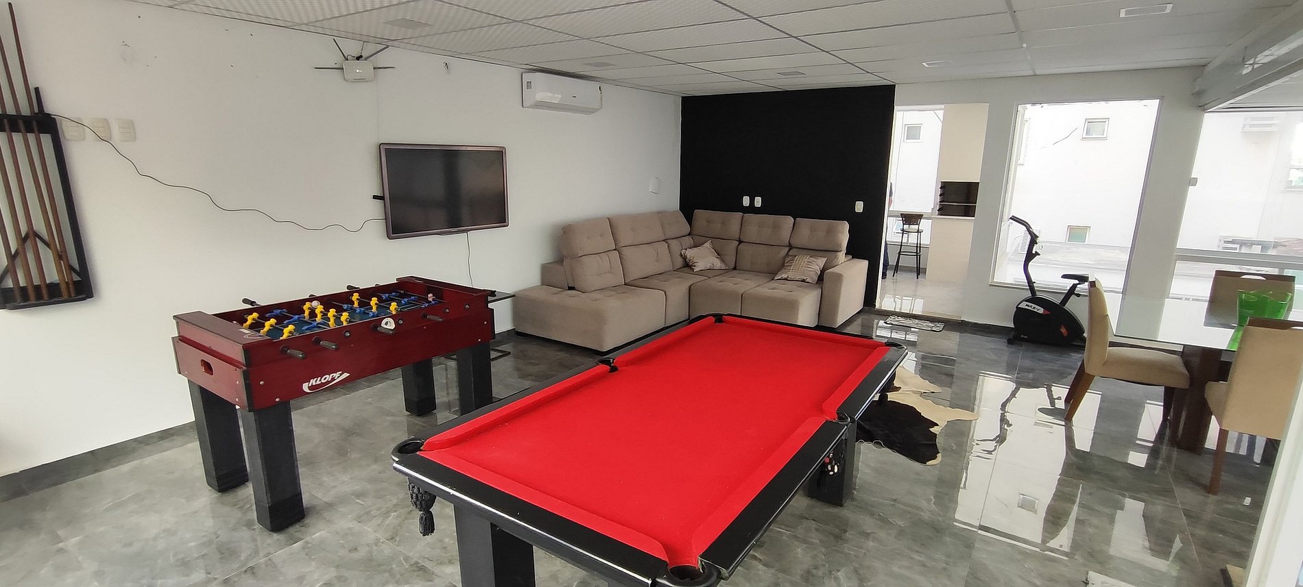 Casa ampla e confortável com 5 quartos, sendo 2 suítes e um quarto enorme exclusivo para jovens, área de lazer com piscina e churrasqueira externa, salão de jogos com pebolim e sinuca integrada a churrasqueira e terraço com espreguiçadeiras e ofurô... Sim, aqui a diversão é garantida. A case recebe, confortavelmente, até 16 pessoas, mas a proprietário aceita até 20 pessoas, considerando crianças e bebês. Possui 2 vagas de garagem cobertas e também é possível estacionar na rua gratuitamente. Fica a poucos passos da praia, que é simplesmente incrível.