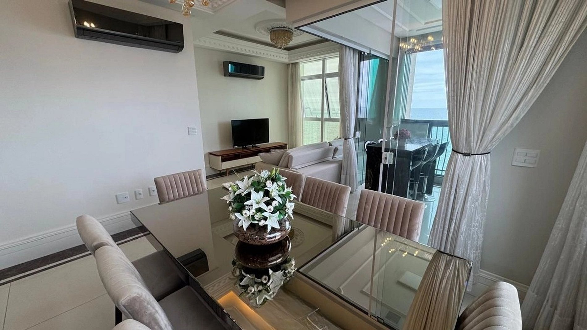 Apartamento amplo e elegante na Rua 241, 35, beira-mar, próximo ao Russi Russi, McDonald's, supermercados, bares e restaurantes renomados. São 4 suítes confortáveis (1 fica fechada), decoração tradicional, sala de estar espaçosa e varanda com churrasqueira e vista para o mar. Duas vagas amplas para carros grandes. Ideal para famílias e grupos que prezam localização, conforto e exclusividade.