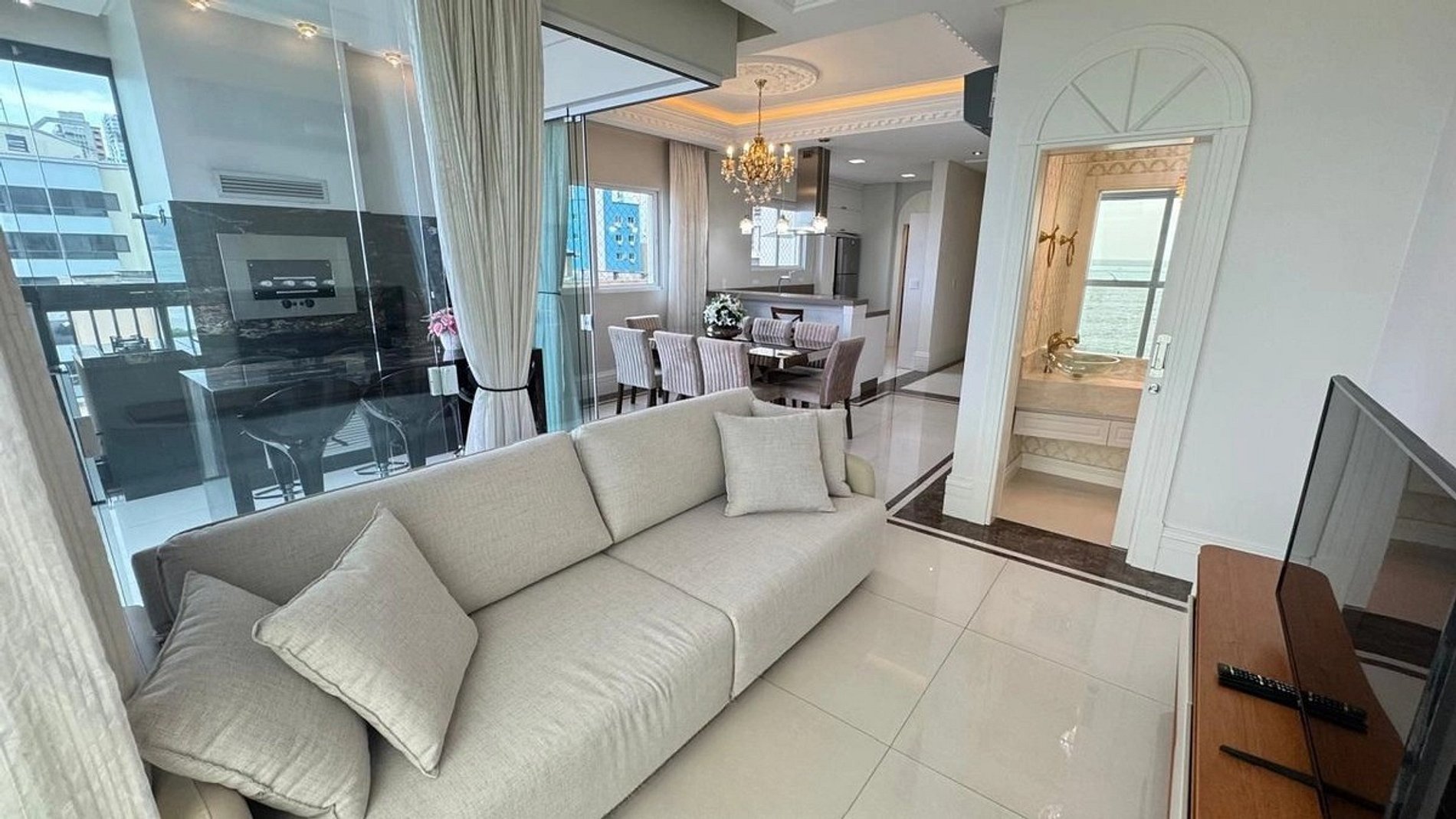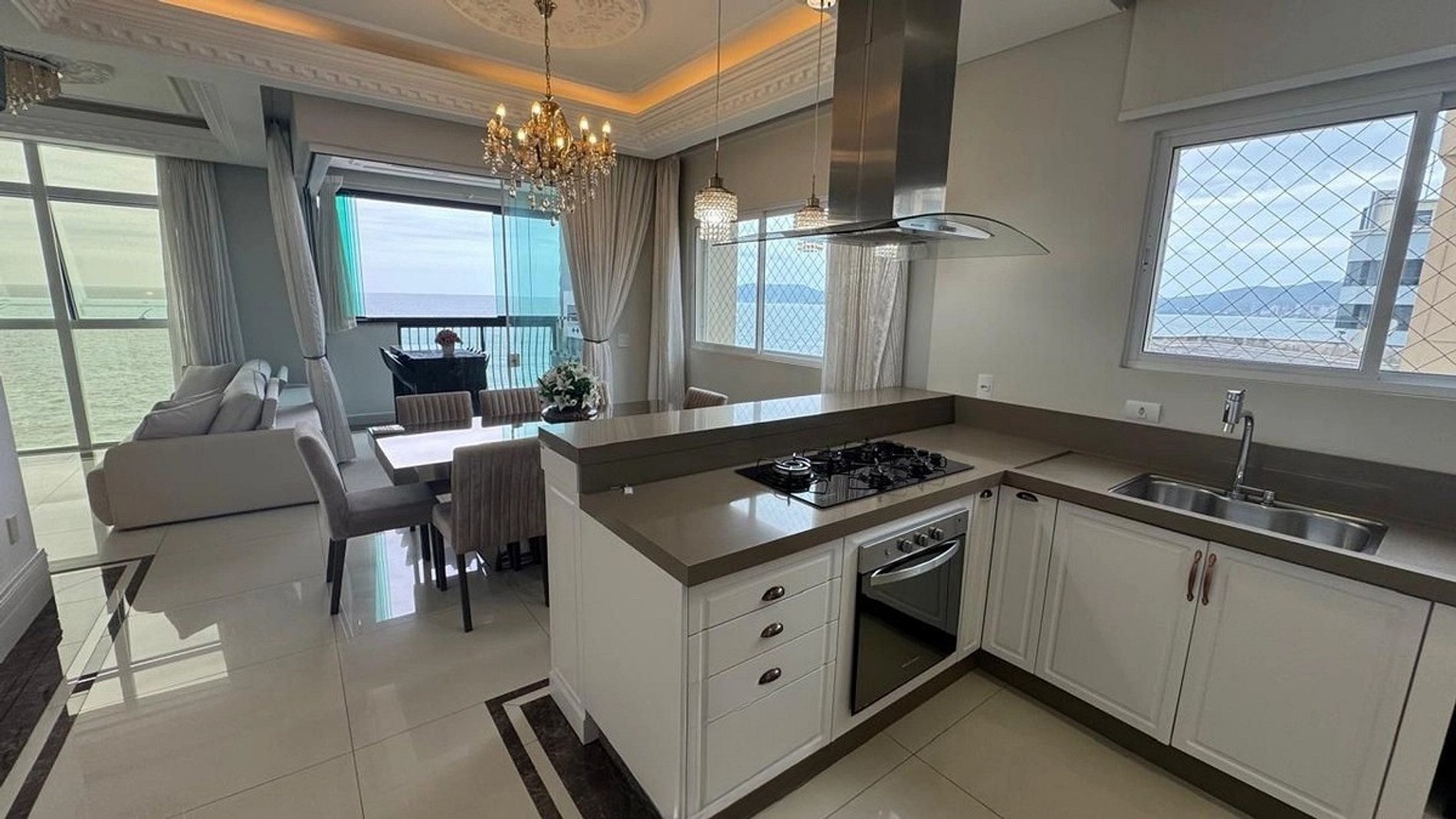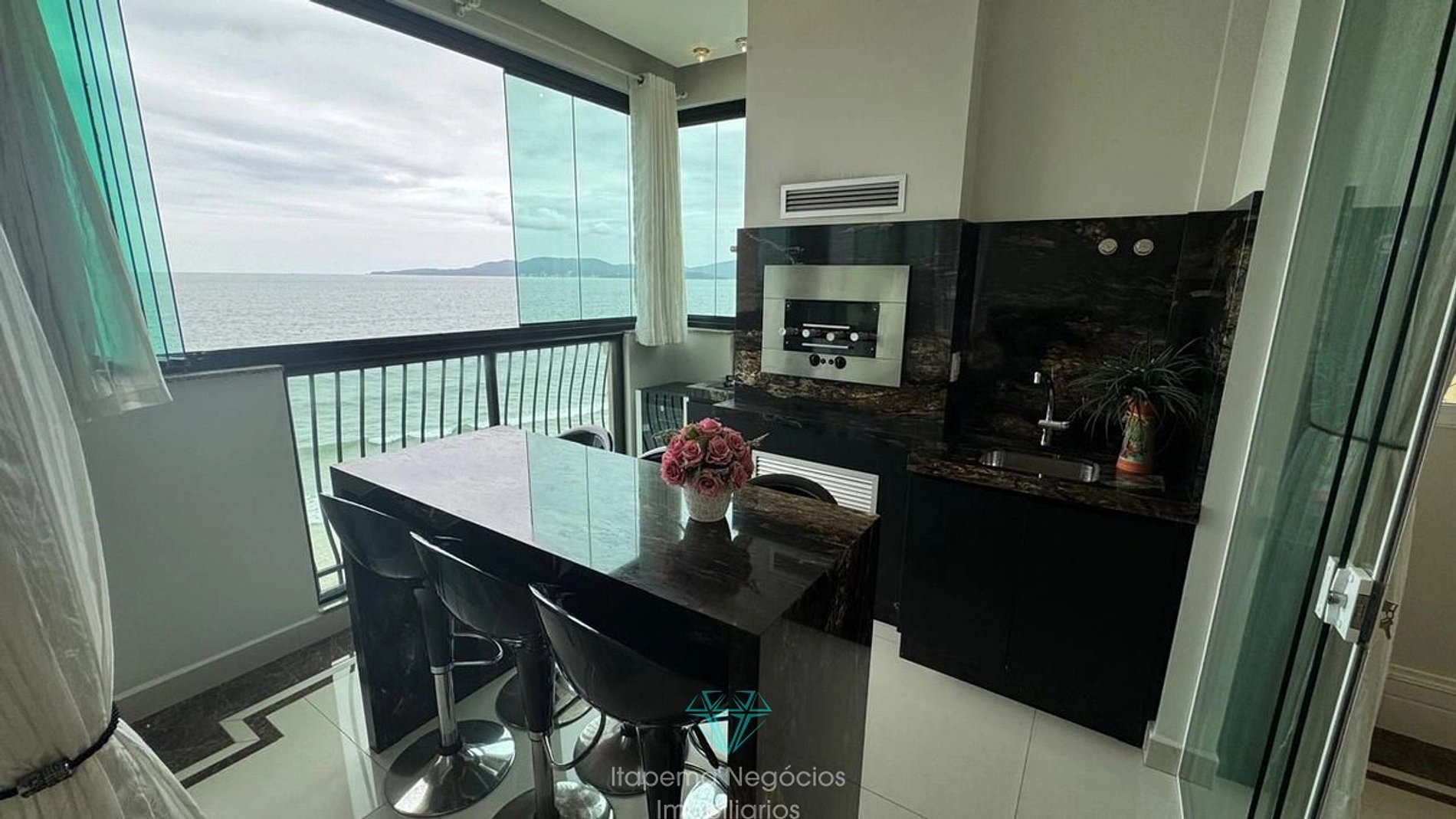 Ambientes sofisticados, bem iluminados e decorados em estilo tradicional. Conta com 4 suítes completas (1 fechada), sala de estar com vista mar, varanda gourmet integrada à cozinha funcional e churrasqueira. Perfeito para confraternizações em família ou entre amigos, com vagas para dois carros grandes.