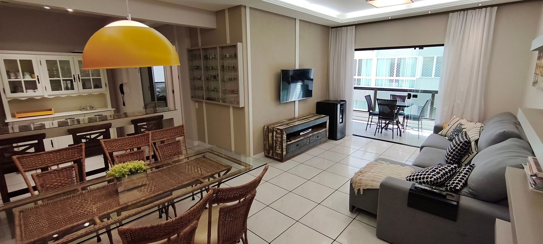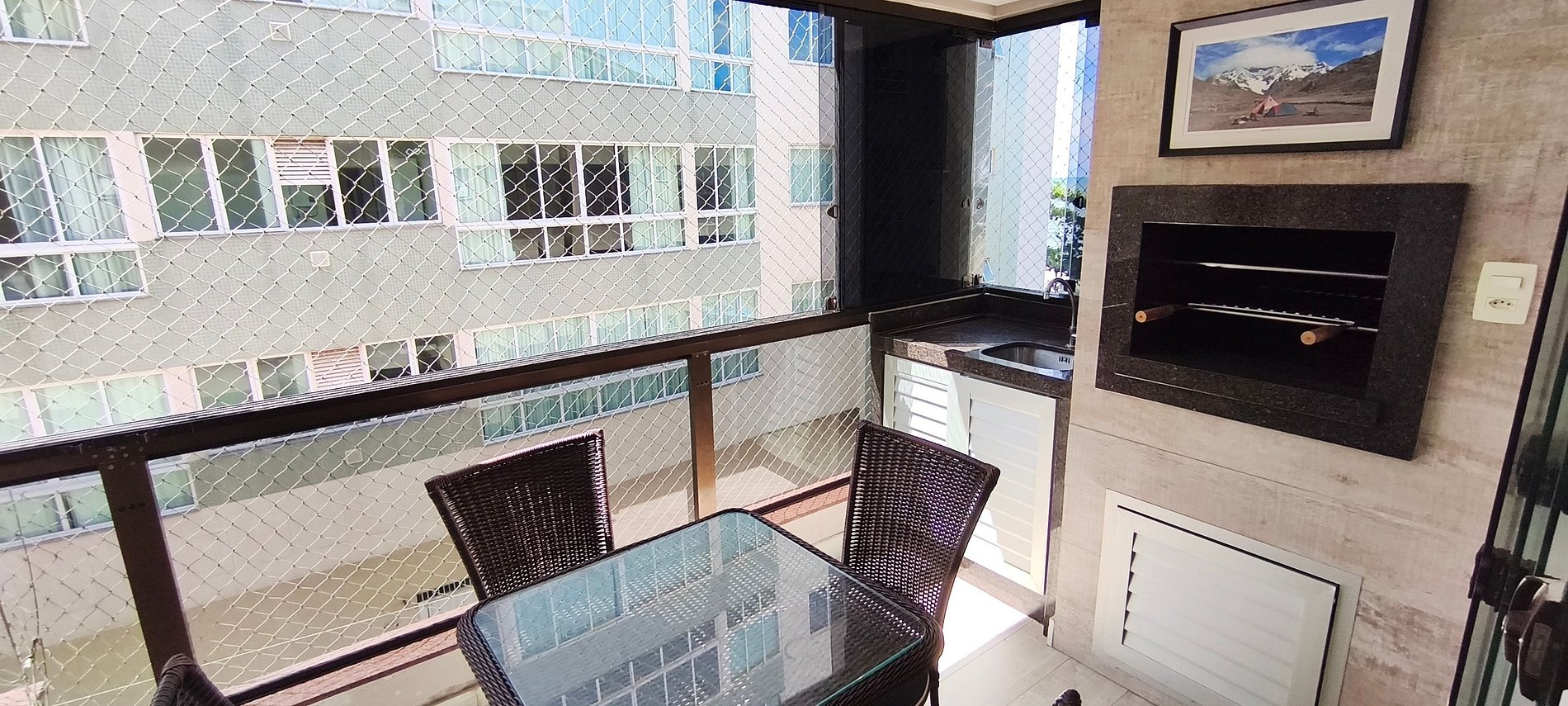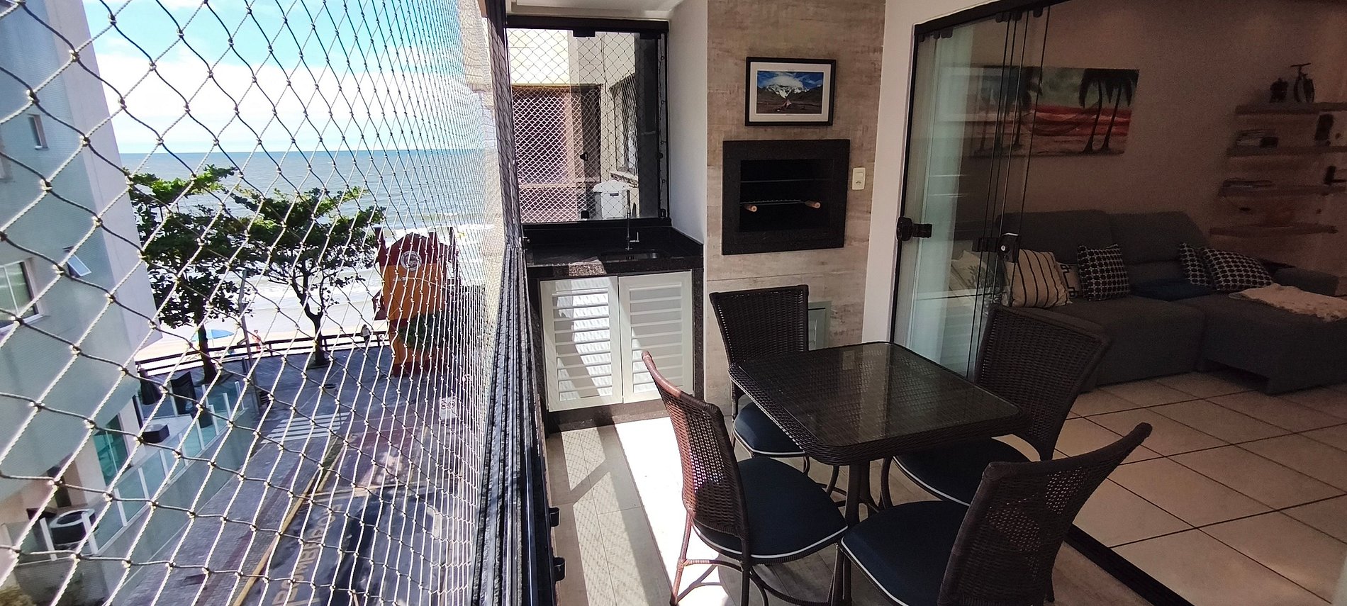 Sacada frente mar com churrasqueira e mesa espaçosa para reunir todos. Todos os quartos disponíveis têm vista e sacada para o mar, garantindo privilégio visual e circulação de ar. Cozinha planejada conecta-se à área de refeições promovendo convívio e praticidade.