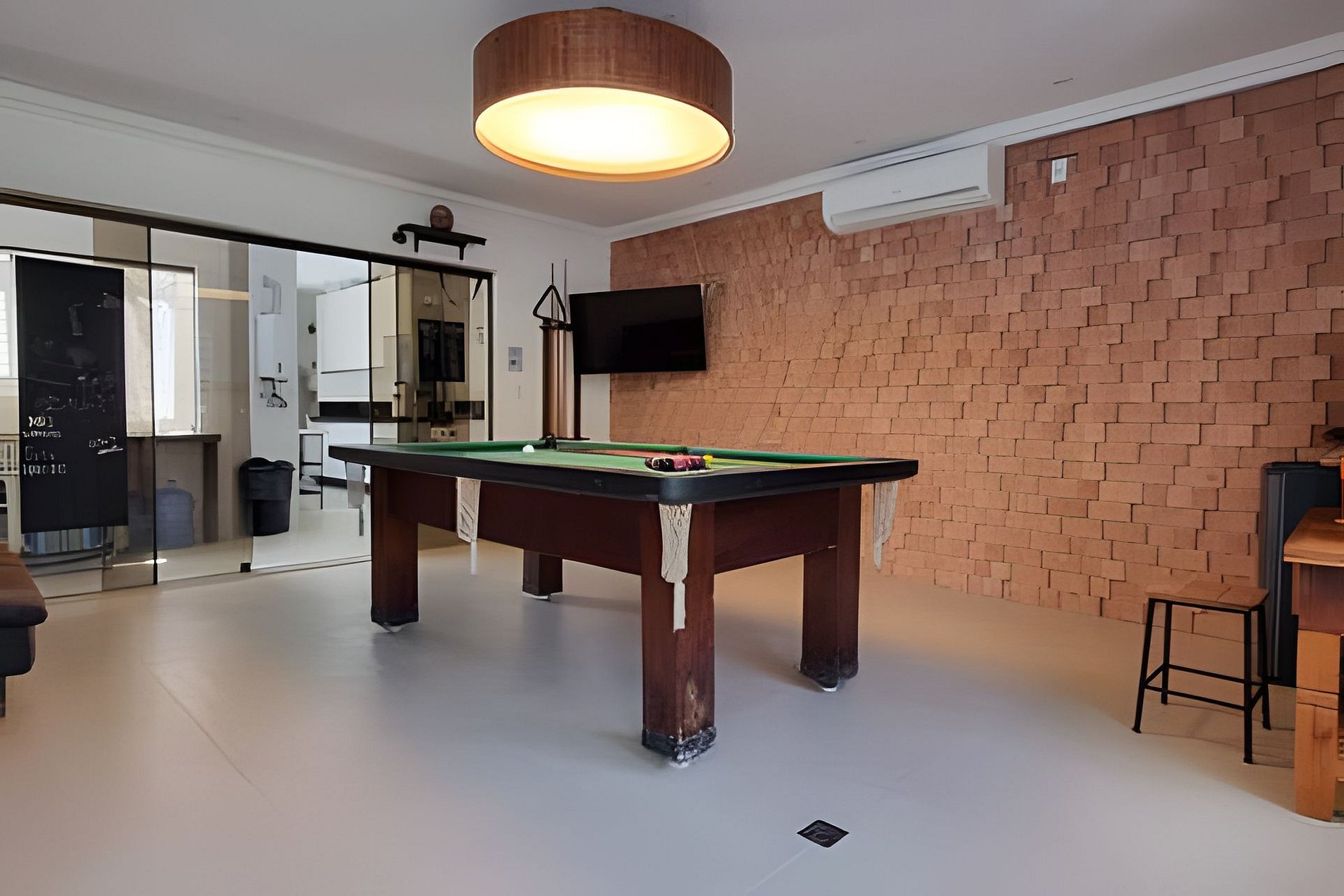Salão de entretenimento com mesa de sinuca, tv smart, cervejeira, frigobar e churrasqueira.