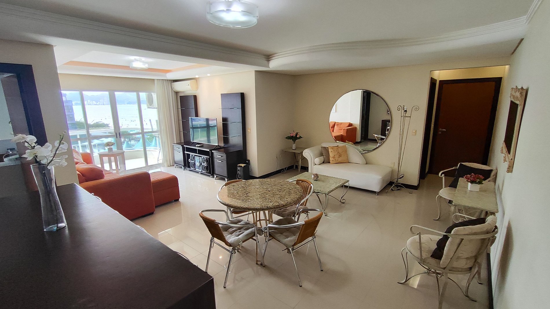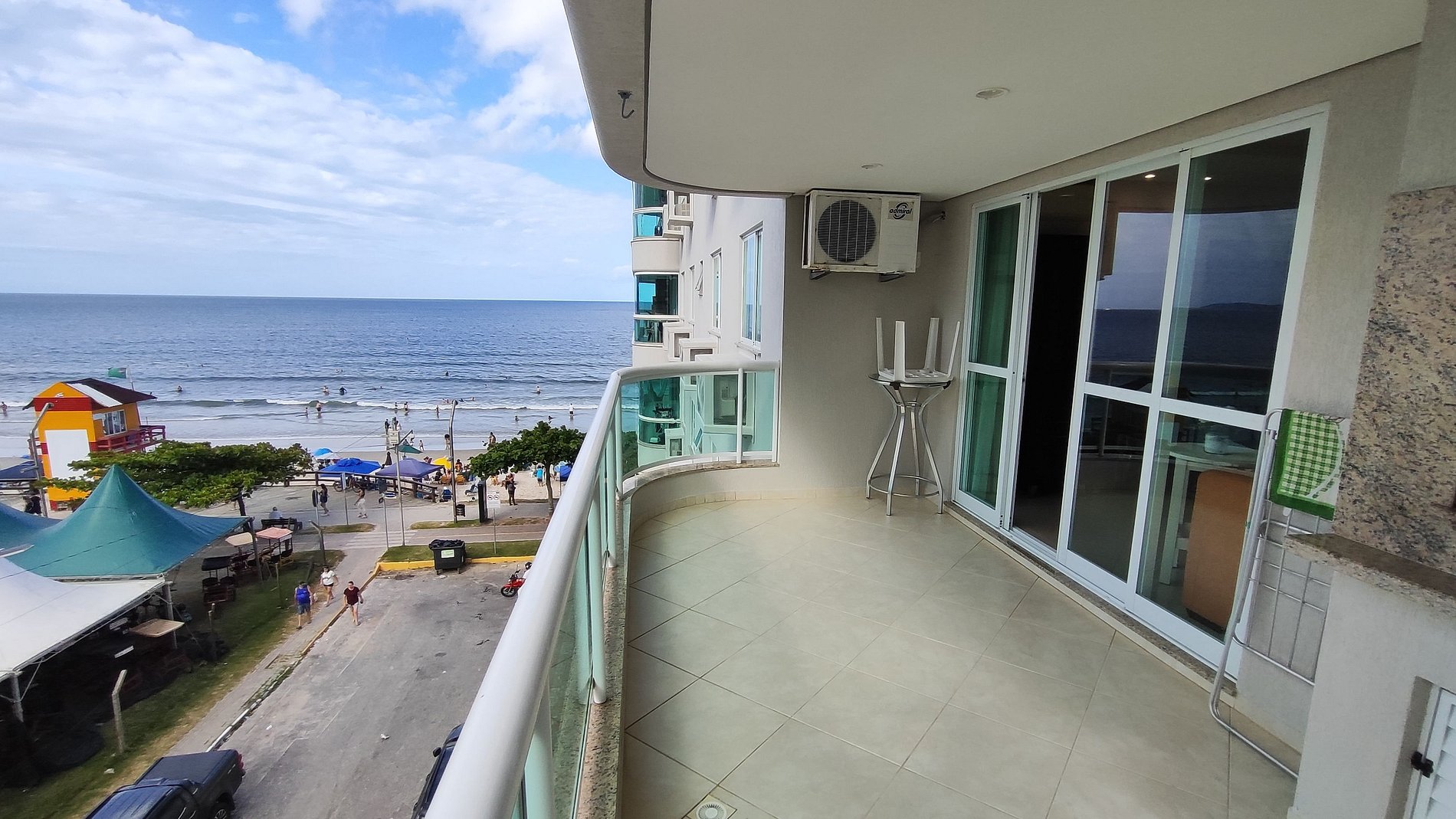 Apartamento beira-mar com planta muito funcional, pensado para quem quer férias com conforto e praticidade em família. A sala de estar integra-se à sala de jantar e à cozinha americana com balcão, criando um ambiente único de convivência. Os 3 quartos são amplos, sendo 1 suíte, proporcionando privacidade e boa circulação para todos. A sacada com churrasqueira e vista mar integral é o grande destaque, perfeita para relaxar, fazer um churrasco e contemplar a praia.