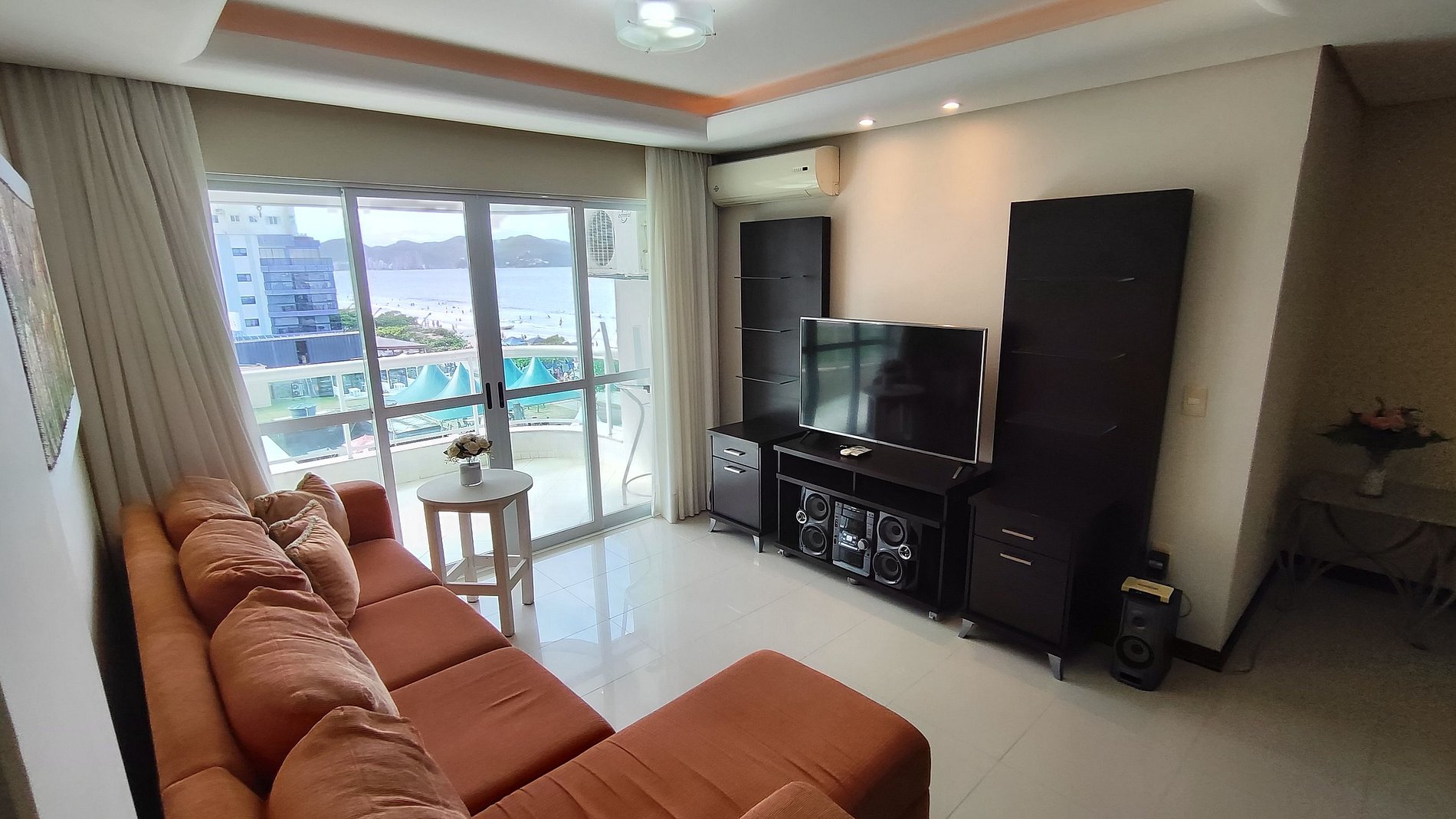 Apartamento beira-mar com planta muito funcional, pensado para quem quer férias com conforto e praticidade em família. A sala de estar integra-se à sala de jantar e à cozinha americana com balcão, criando um ambiente único de convivência. Os 3 quartos são amplos, sendo 1 suíte, proporcionando privacidade e boa circulação para todos. A sacada com churrasqueira e vista mar integral é o grande destaque, perfeita para relaxar, fazer um churrasco e contemplar a praia.