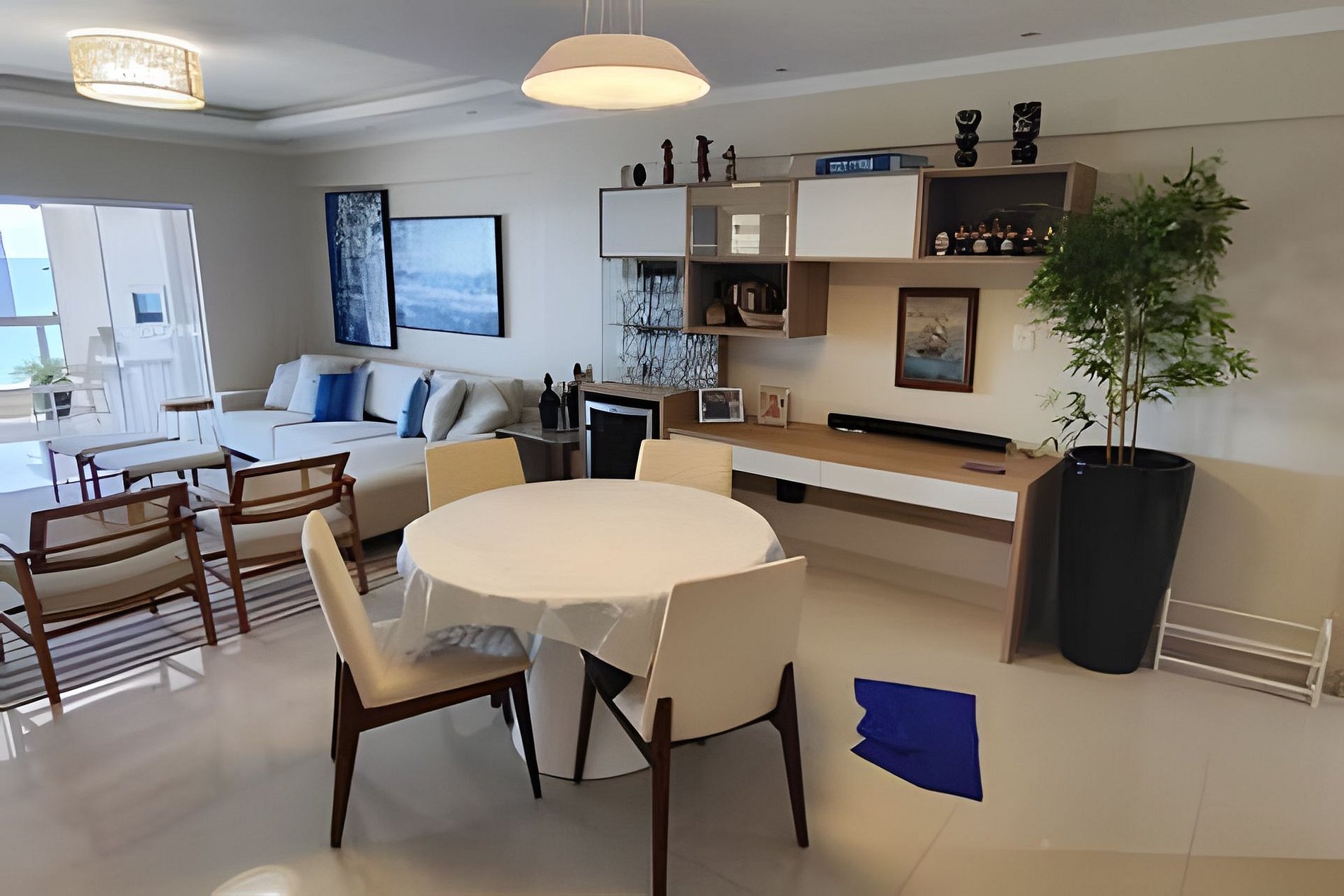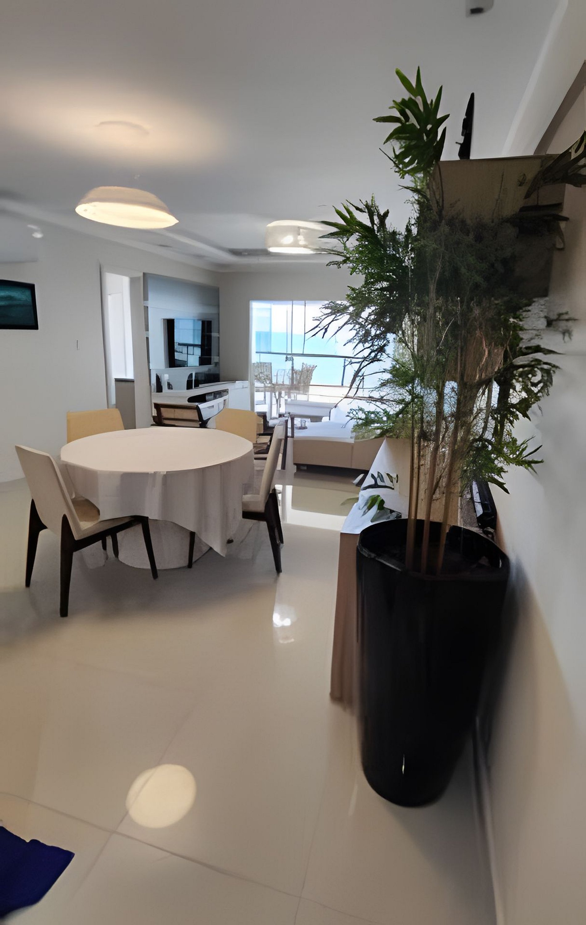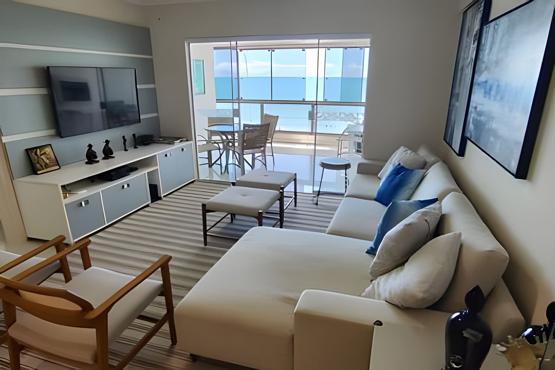 A sala é ampla, integrada à varanda e cozinha, com sofá, poltronas e TV Led, promovendo um ambiente acolhedor e ideal para eventos em família. O apartamento é pé na areia, em um condomínio fantástico com muita área verde para as crianças e espaço para tomar mate ou apenas estar. Possui 2 vagas de garagem privativas para carros médios e camionetes, podendo ser locada mais 1 vaga em local próximo por 50 reais.