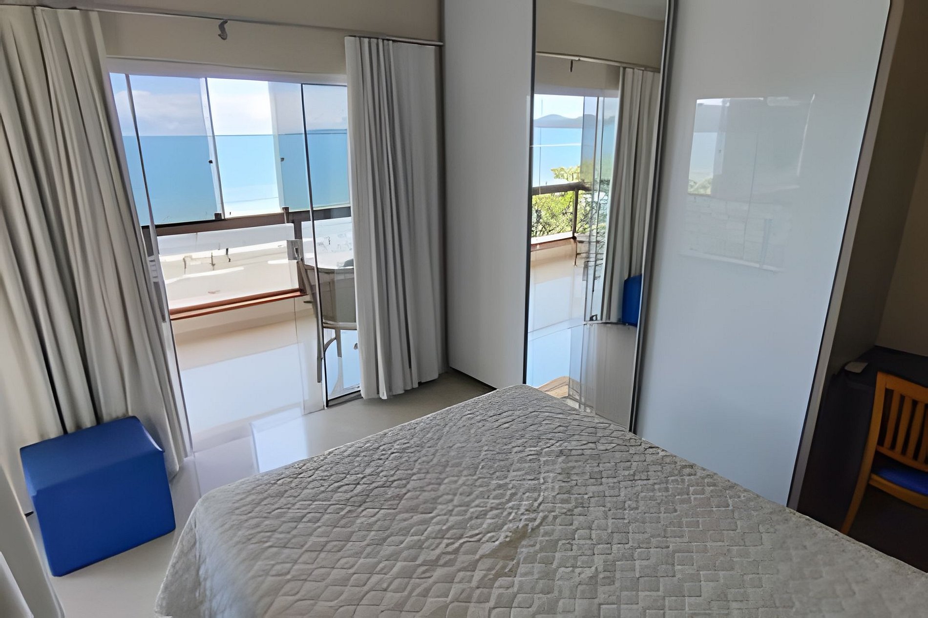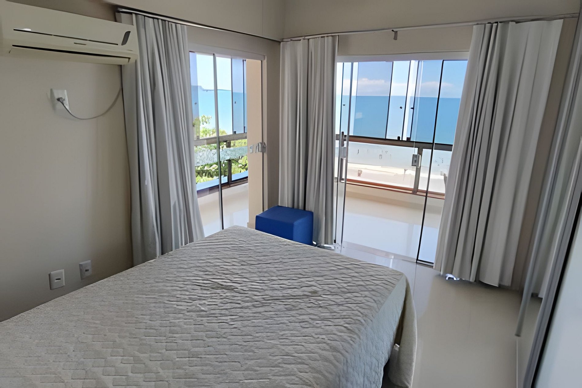 O espaço é amplo e aconchegante, com uma varanda confortável e vista para o mar. É ideal para famílias com filhos pequenos, pois possui 4 quartos, com 1 suíte com cama de casal, 1 quarto com cama de casal e Bicama, e 1 quarto com cama de casal e cama auxiliar e mais 1 quarto individual (que neste momento encontra-se fechado, com as coisas da proprietária), além de 2 colchões de solteiro à disposição. Todos os quartos tem ar condicionado.