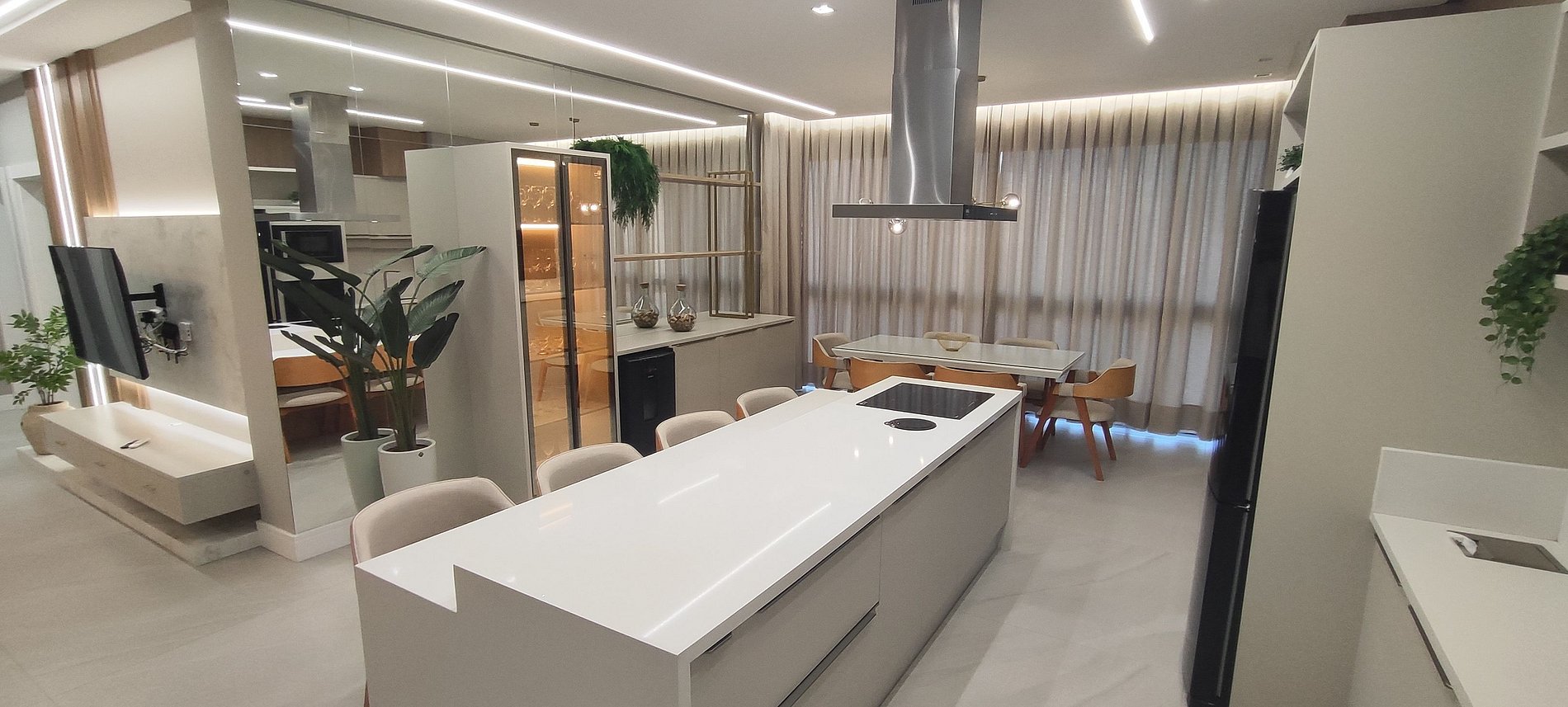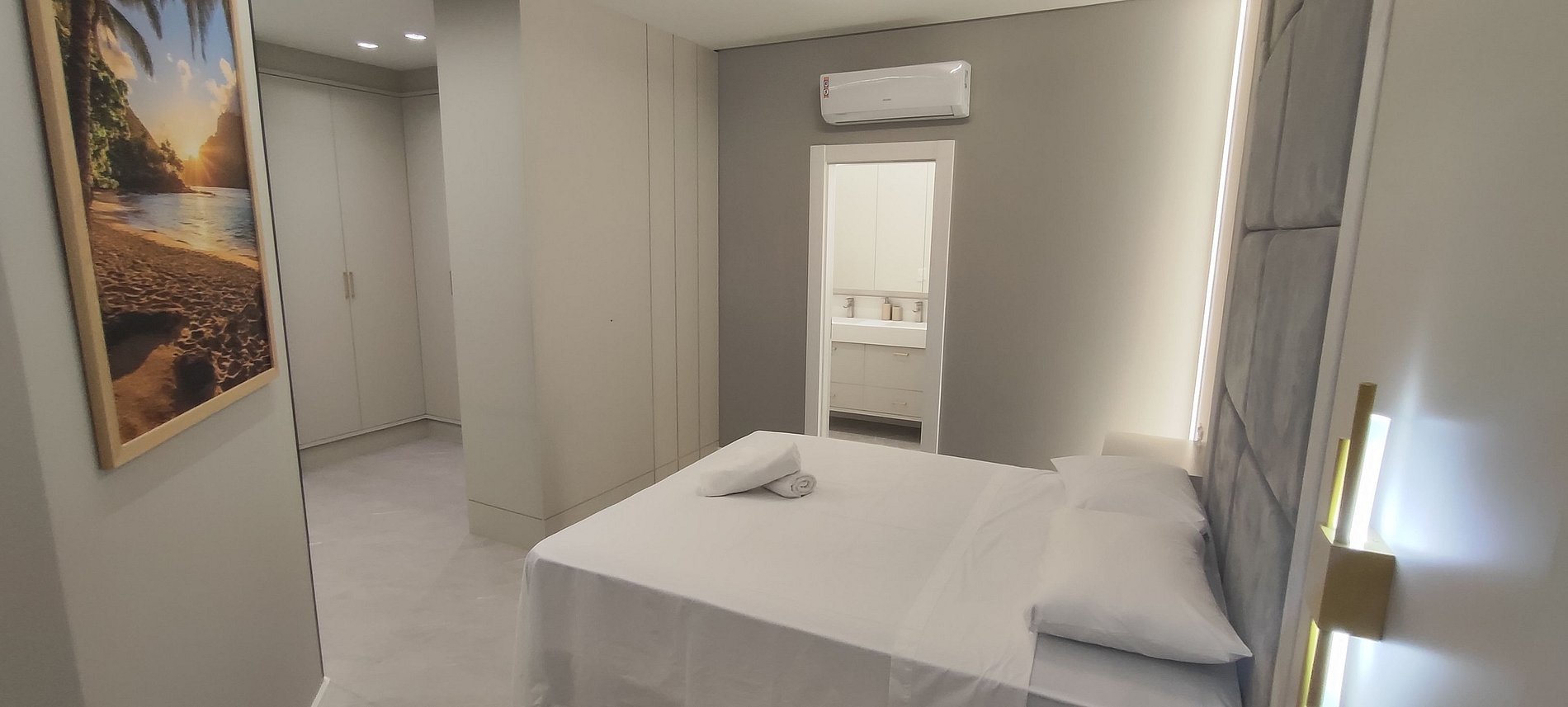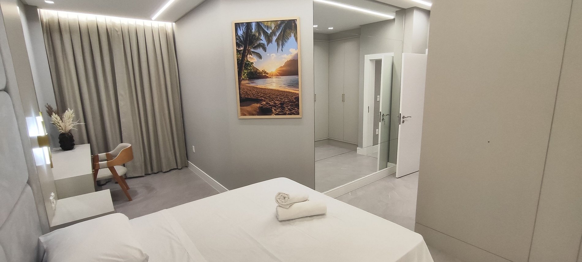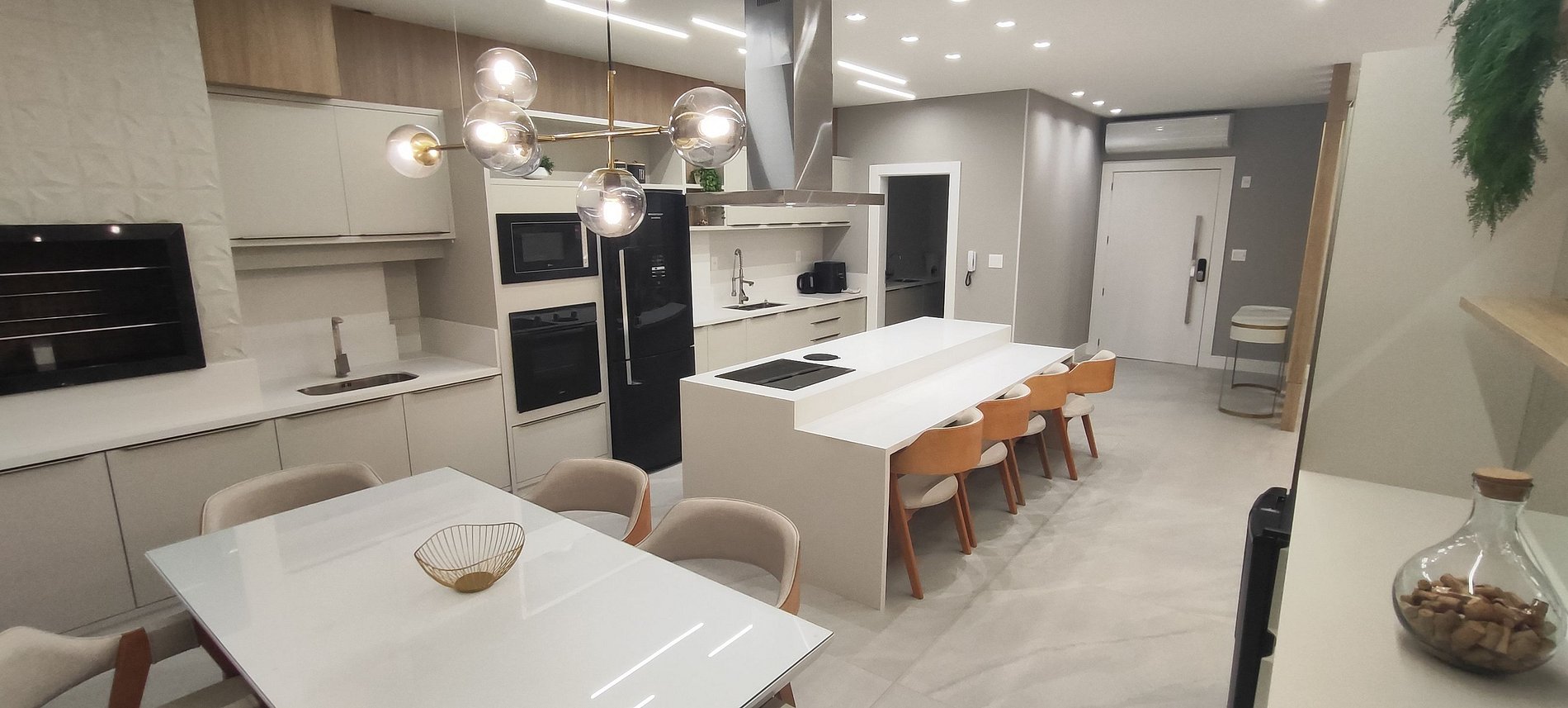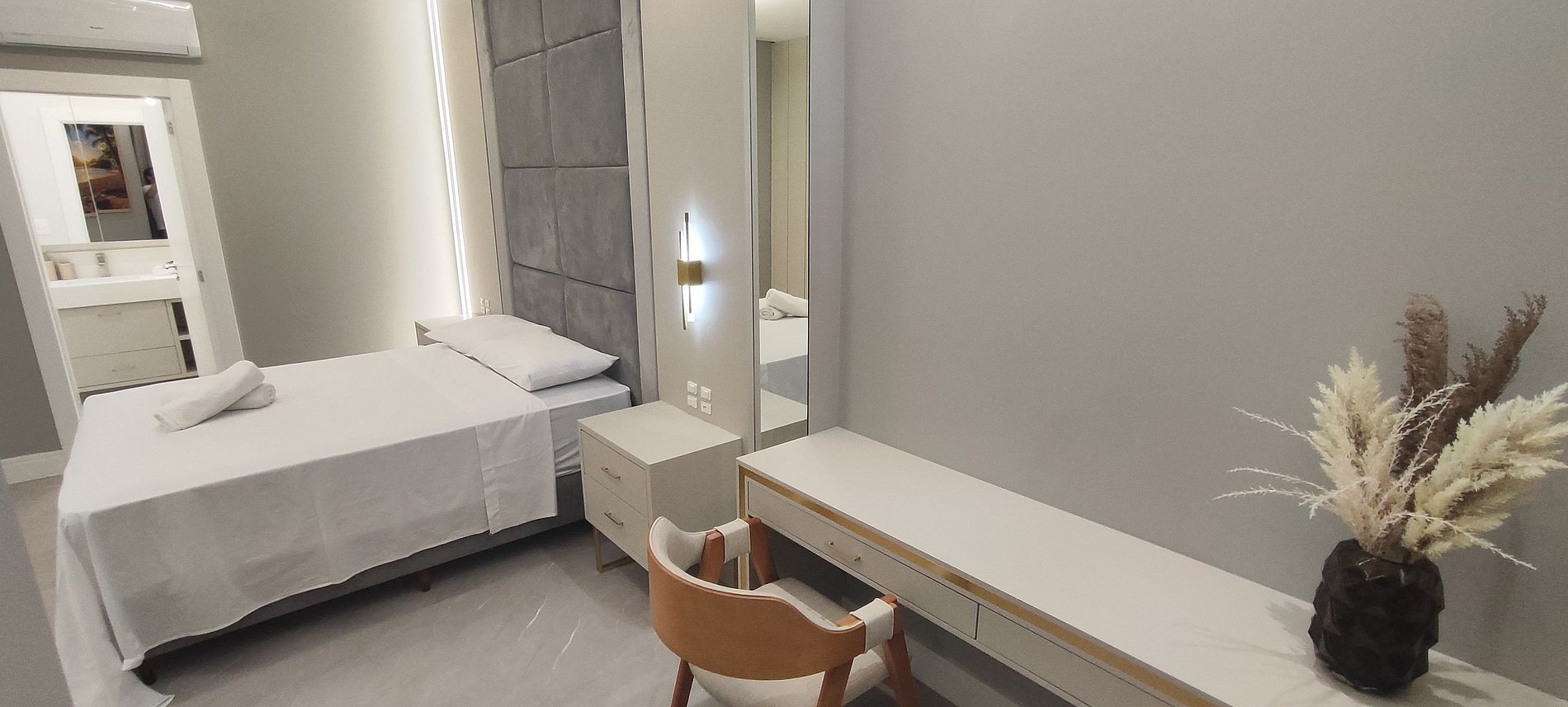 Espaço amplo e moderno, recém-entregue, com 168 m² privativos e 3 suítes queen, sendo a master com closet e espaço para trabalho. Sala de estar confortável com TV 65", cozinha gourmet integrada à sala de jantar, ilha para confraternizações e churrasqueira com vista para o mar. Decoração impecável, enxoval completo, camas montadas, papel, sabonete, shampoo da Amazônia, detergente, bucha e água de boas-vindas. Ambiente climatizado, ideal para descanso, trabalho e confraternizações.